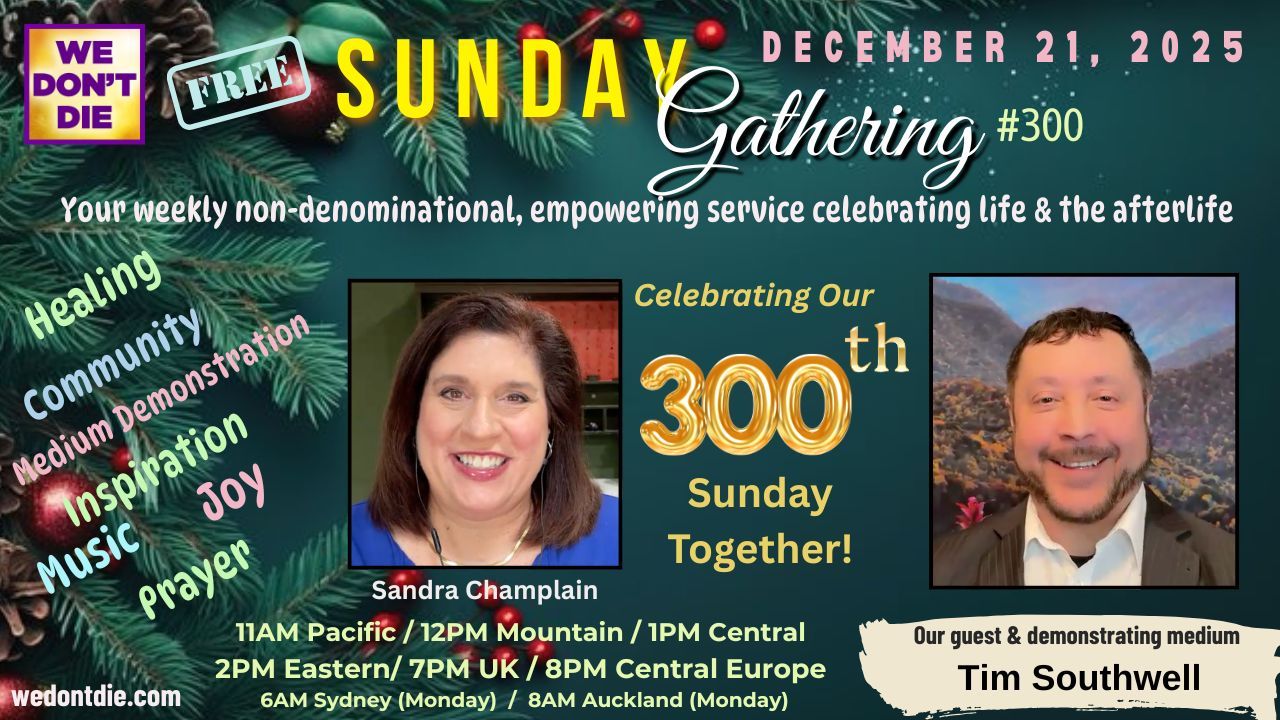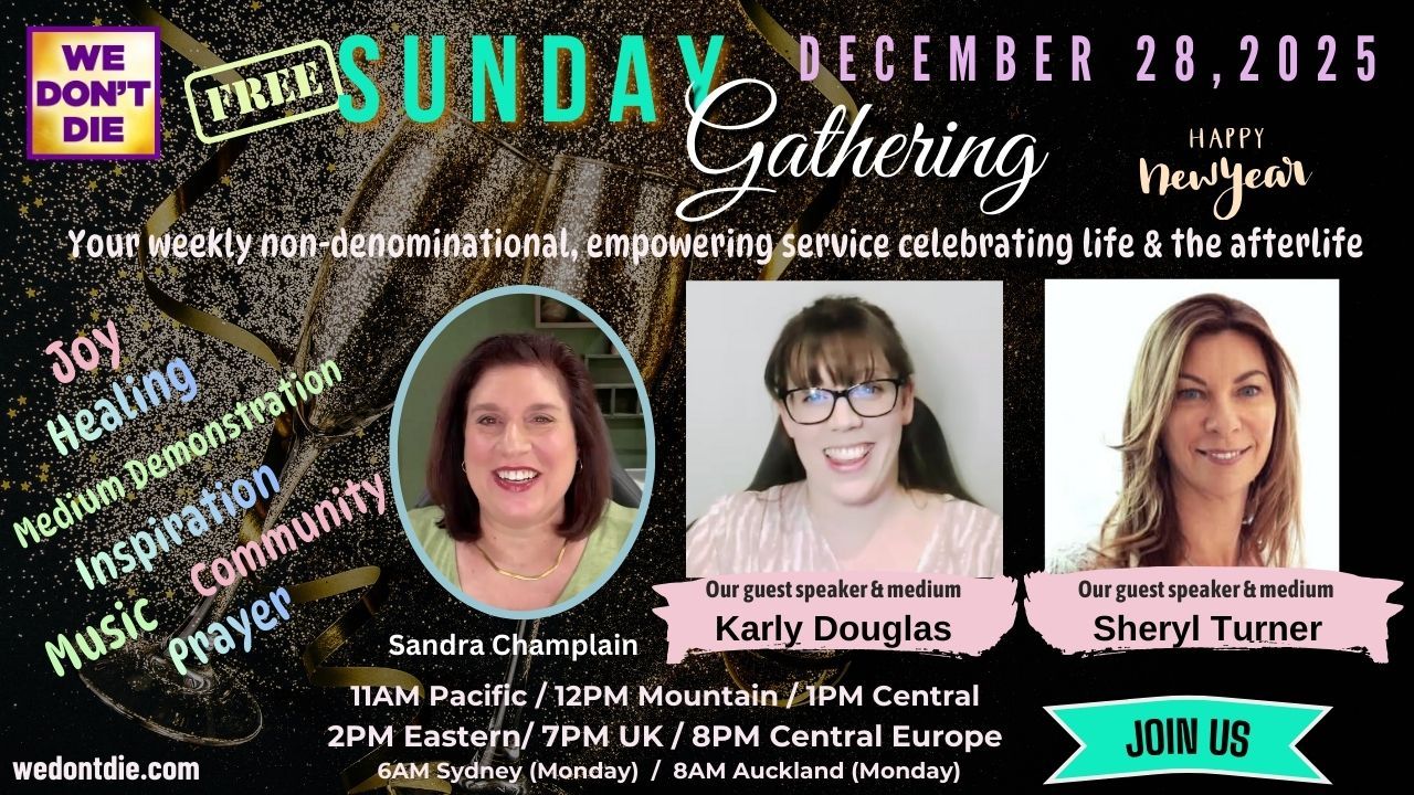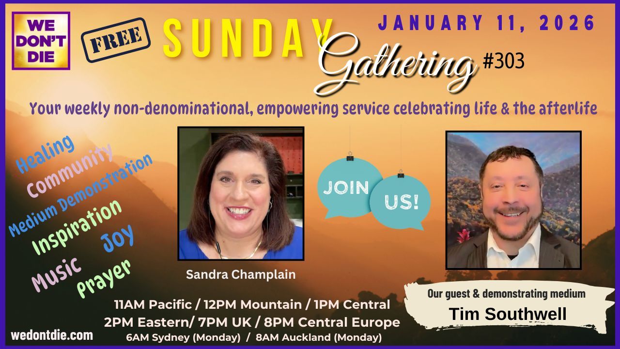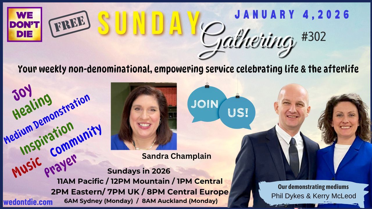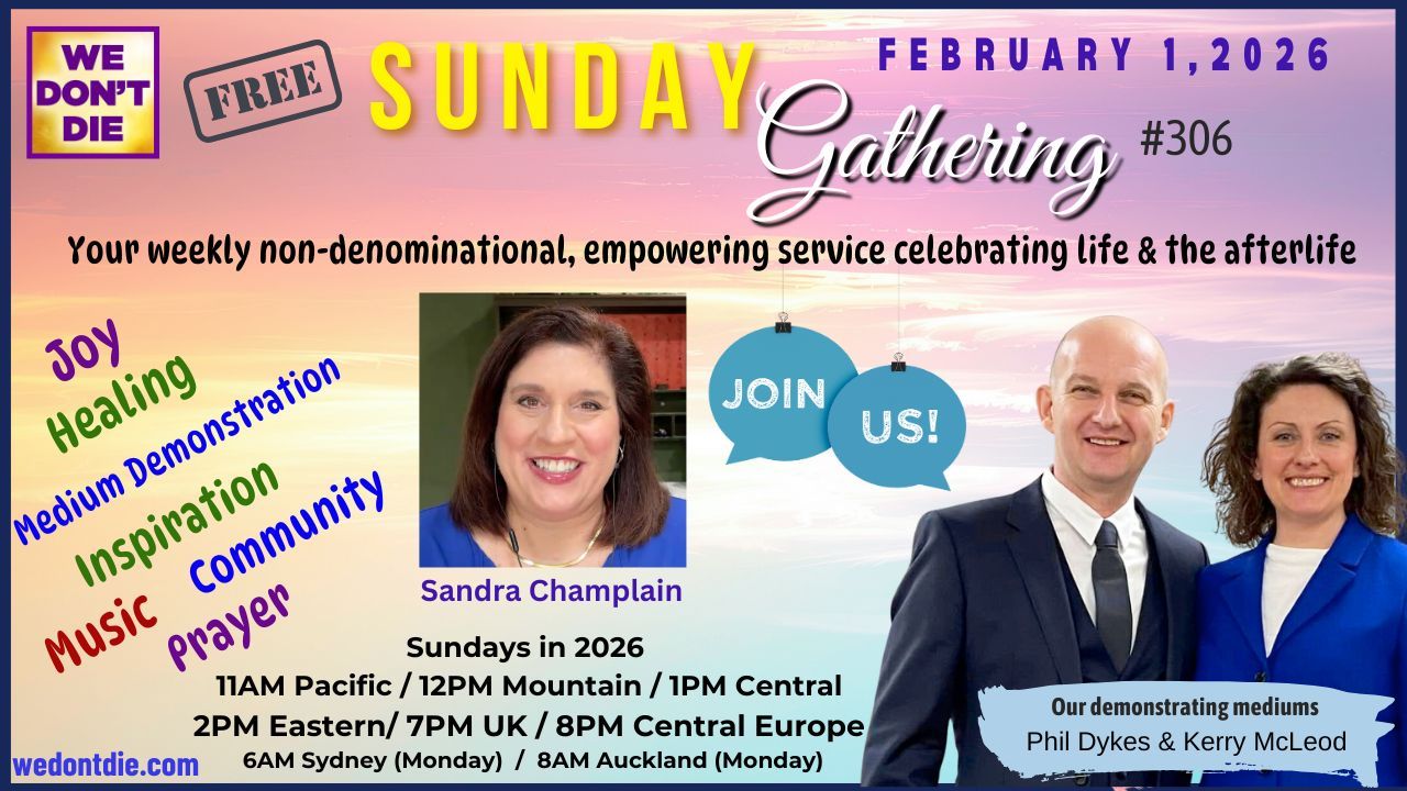 Each Sunday, join Sandra, Kerry, Phil and Darren and special guests, as we celebrate life and the afterlife in this very inspiring online service. A different, empowering theme every week with a medium demonstration included. FREE - to see past replays or leave a donation toward our service, click on the "Sunday Gathering" tab at the top of this page